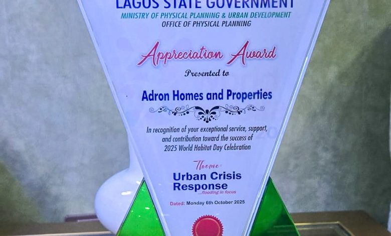 Adron Homes has once again reaffirmed its leadership position in the Nigerian real estate sector as it was honoured with an Appreciation Award by the Lagos State Government under the Ministry of Physical Planning and Urban Development.