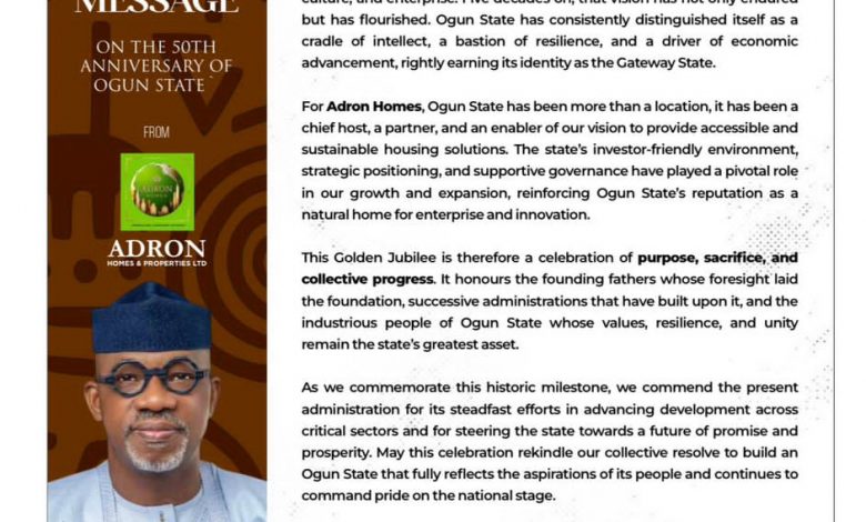 Adron Group Congratulates Ogun State At 50, Salutes Legacy of Progress | Prestige Real Estate News